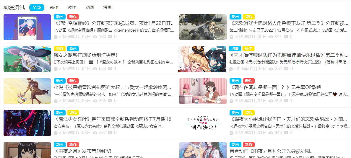 1、AniFun动漫提供全面的ACG导航,帮助用户快速找到感兴趣的动漫、游戏和小说资源。同时,平台还发布最新的动漫资讯,让用户能够及时了解行业动态。
