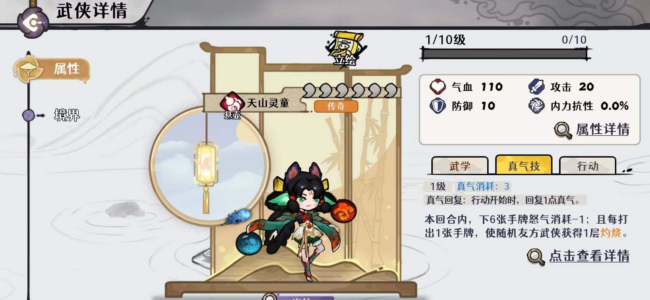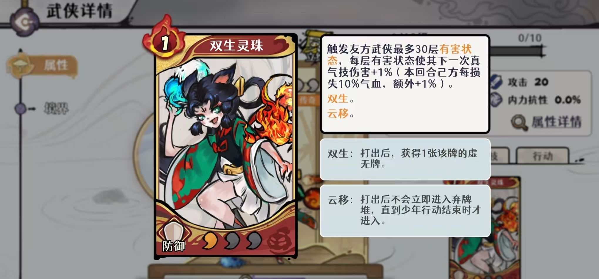 核心武学【双生灵珠】具备三层关键效果:第一,可为目标友方武侠叠加最高30层“有害状态”,每层提升其下一次真气技能1%伤害;第二,本回合己方每损失10%气血,额外赋予1%真气技能增伤;第三,真气技能生效时,行动开始恢复1点真气,并使当回合打出的前6张手牌怒气消耗-1;此外,每使用一张手牌,即随机为一名友方附加1层灼烧。该机制完美串联“自损换输出”与“灼烧持续压场”双轴,配合满经脉状态下全队暴击伤害+8%的被动,使其成为火系真气流与极限自残流的共用支点。