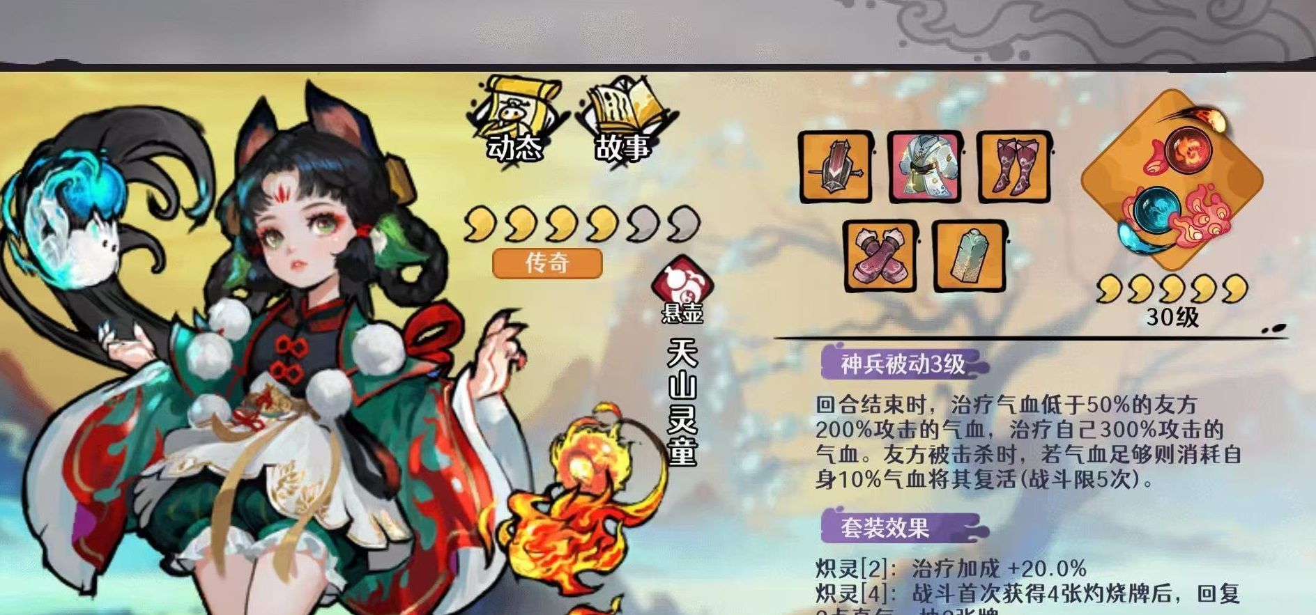 装备方面,主推炽灵四件套+卧龙之袍组合。炽灵四件套提供20%治疗加成,并在战斗首次凑齐四张灼烧牌时,恢复2点真气并额外抽两张牌,极大强化自残流续航与过牌能力。除主流自残路线外,亦可尝试火系爆发变体,例如搭配天道剑圣与圣僧,利用灵童减怒与增伤特性放大灼烧叠层速度及真气技能释放频次,提升全自动PVE流程稳定性。但需注意,该变体在综合输出与容错率上仍逊于完整自残体系,故不作为首推方案。