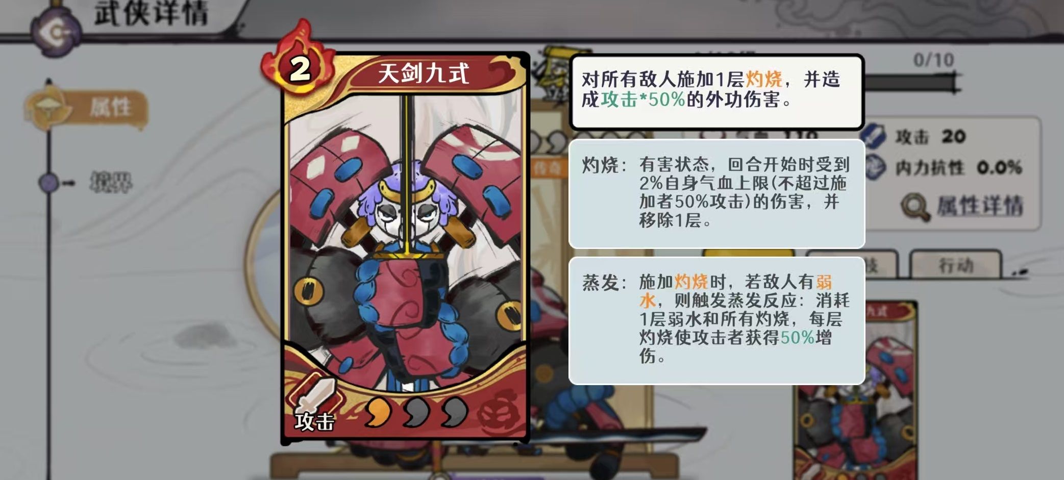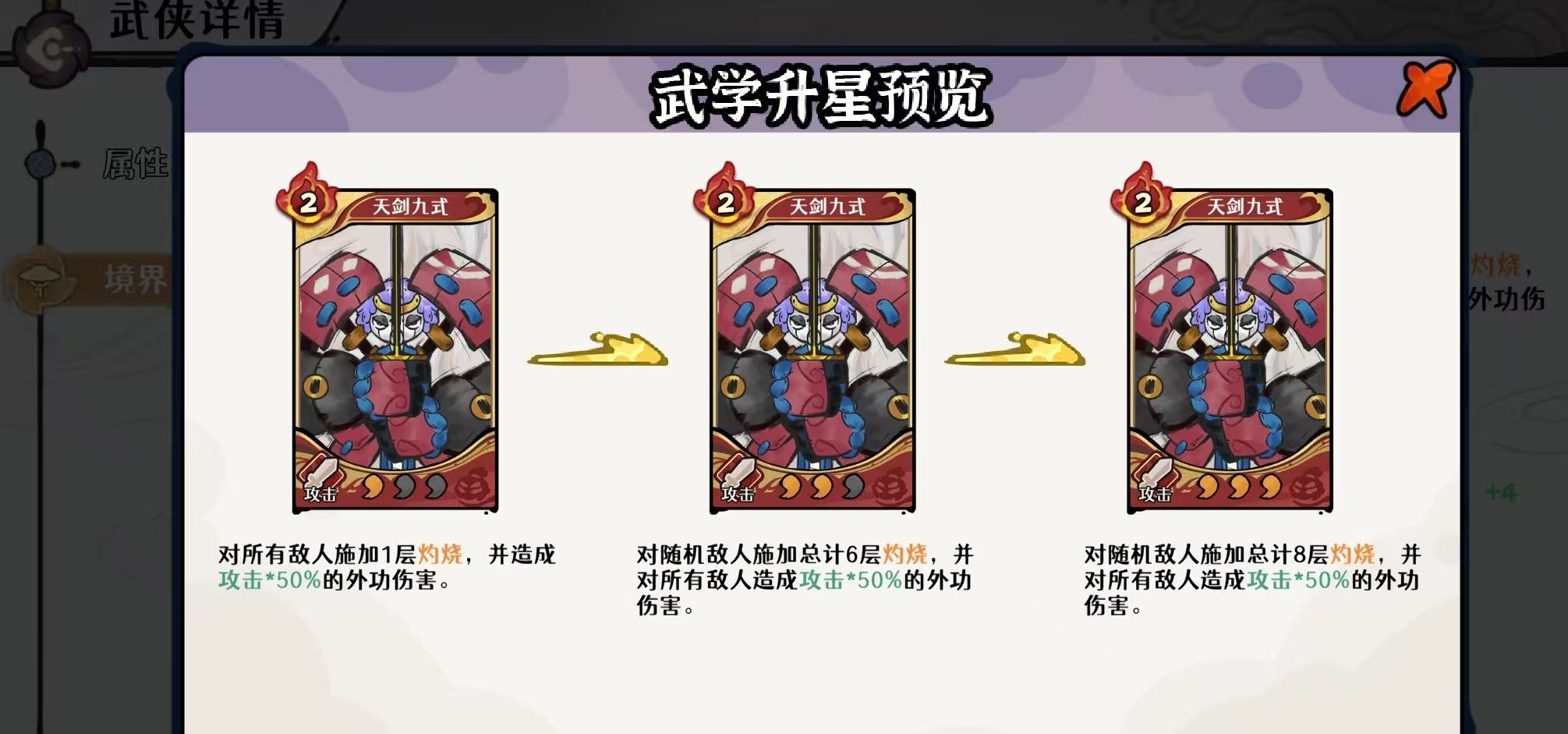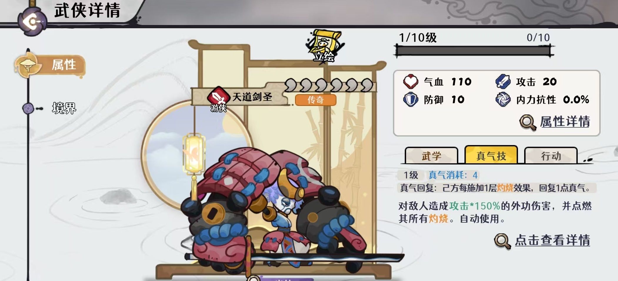 天道剑圣属游侠职业,主打高频多段外功伤害。核心武学【天剑九式】可对全体敌方施加一层灼烧状态,并附加外功伤害。灼烧为持续性负面效果:每回合开始时,目标承受相当于自身血气上限2%的伤害,并自动清除一层。若目标同时处于弱水状态,则触发“蒸发”反应——消耗一层弱水与全部灼烧层数,使天道剑圣获得增伤增益。其真气技能可自动释放,对当前目标造成外功伤害并点燃所有灼烧层数,实现真气回充与伤害倍化双重收益。整体定位为火系游侠主C,依靠灼烧循环驱动自动连招,形成高频率、高覆盖率的外功爆发链。