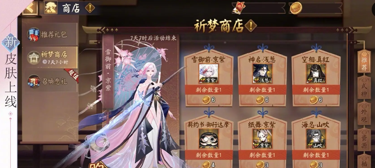 雪御前典藏皮肤「京紫」于2026年1月3日维护后上线,可通过限时召唤活动获取。活动期间享受2次SSR/SP概率UP,累计召唤可获得「祈梦印章」,用于在商店直接兑换此套华美皮肤。