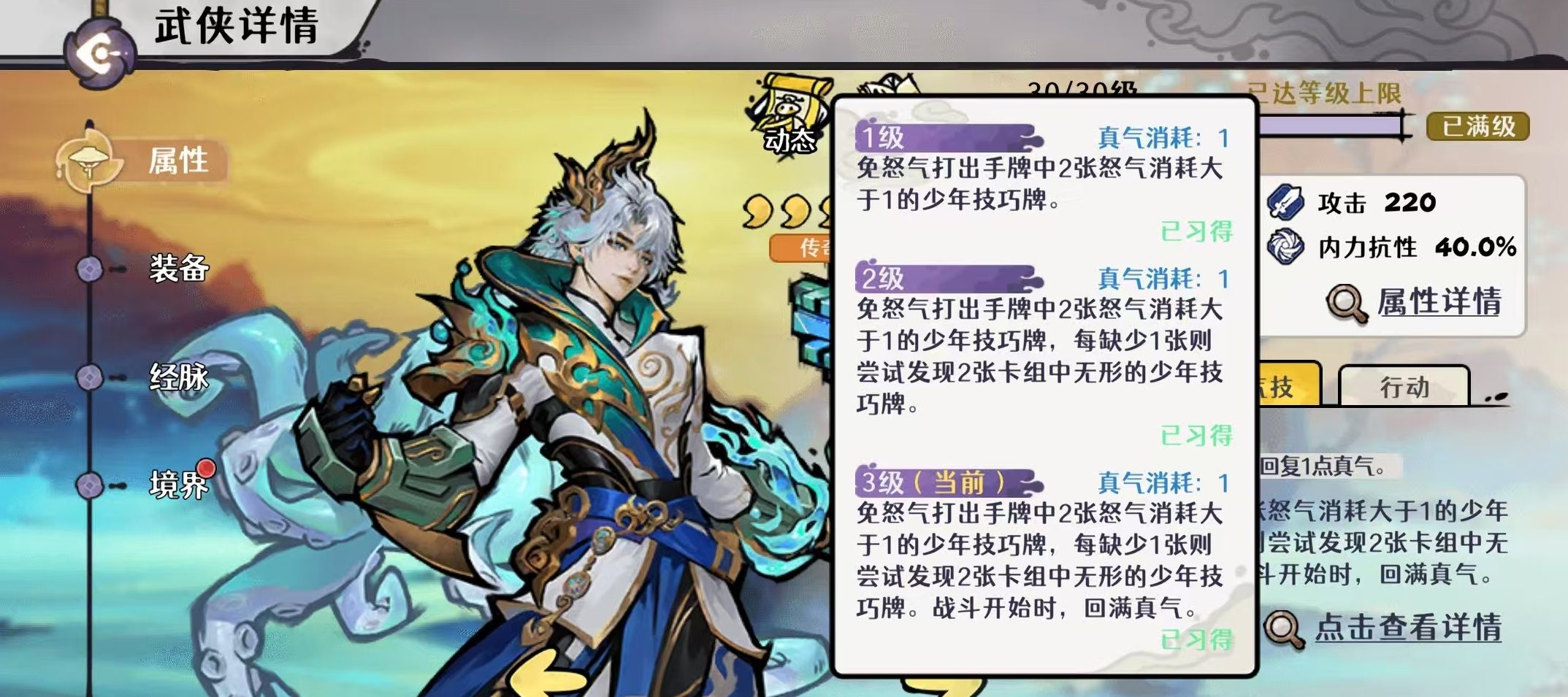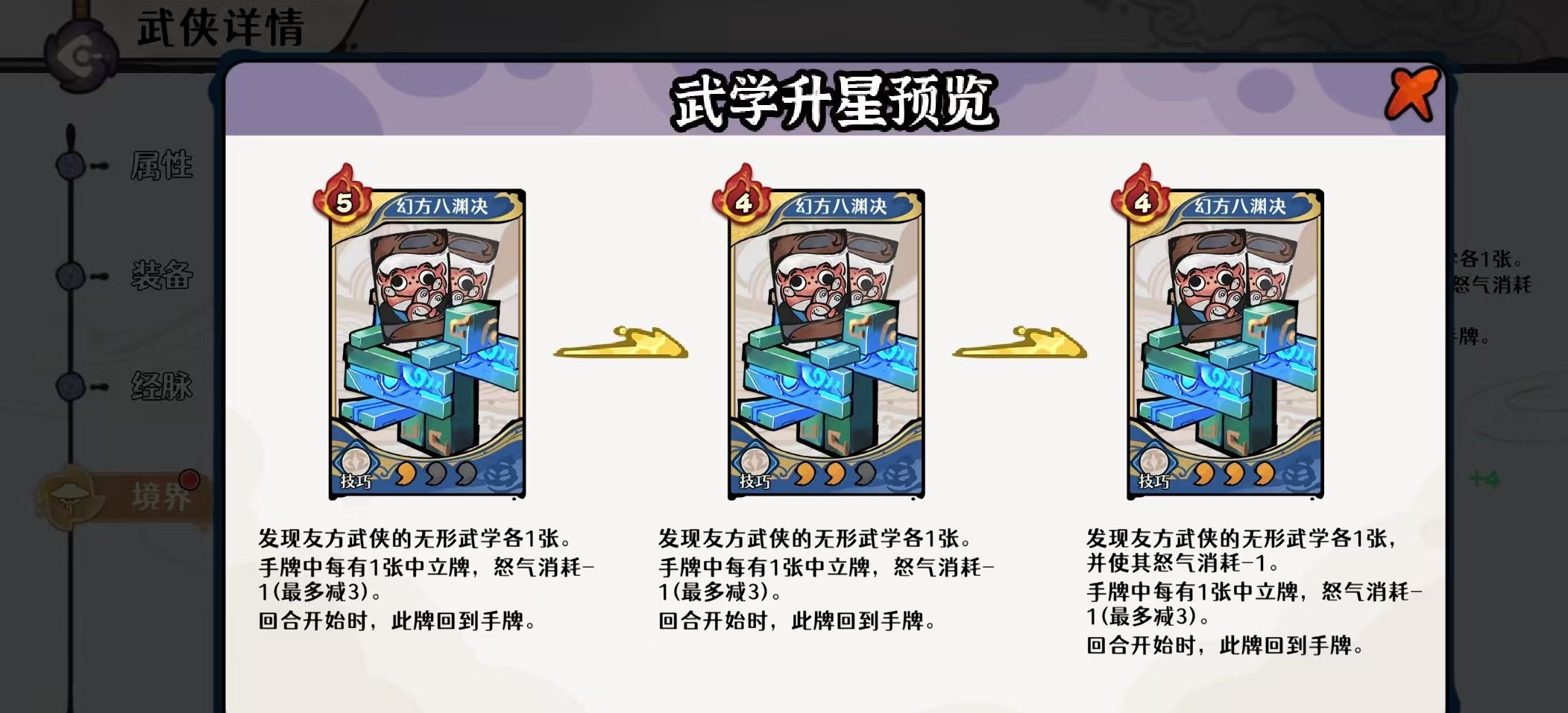 养成路径清晰明确:零命即可开启经脉并使用悬壶技能,初步具备实战价值,但受限于真气技2点消耗,手牌循环稳定性较弱;二命后真气技消耗降至1点,实现每回合稳定释放,跃升为必练核心;四命进一步强化循环效率与爆发潜力——技巧牌可额外回复怒气,显著提升节奏强度。若主玩飞刀流或叠甲流,建议至少抽取至二命,以确保体系运转流畅。
