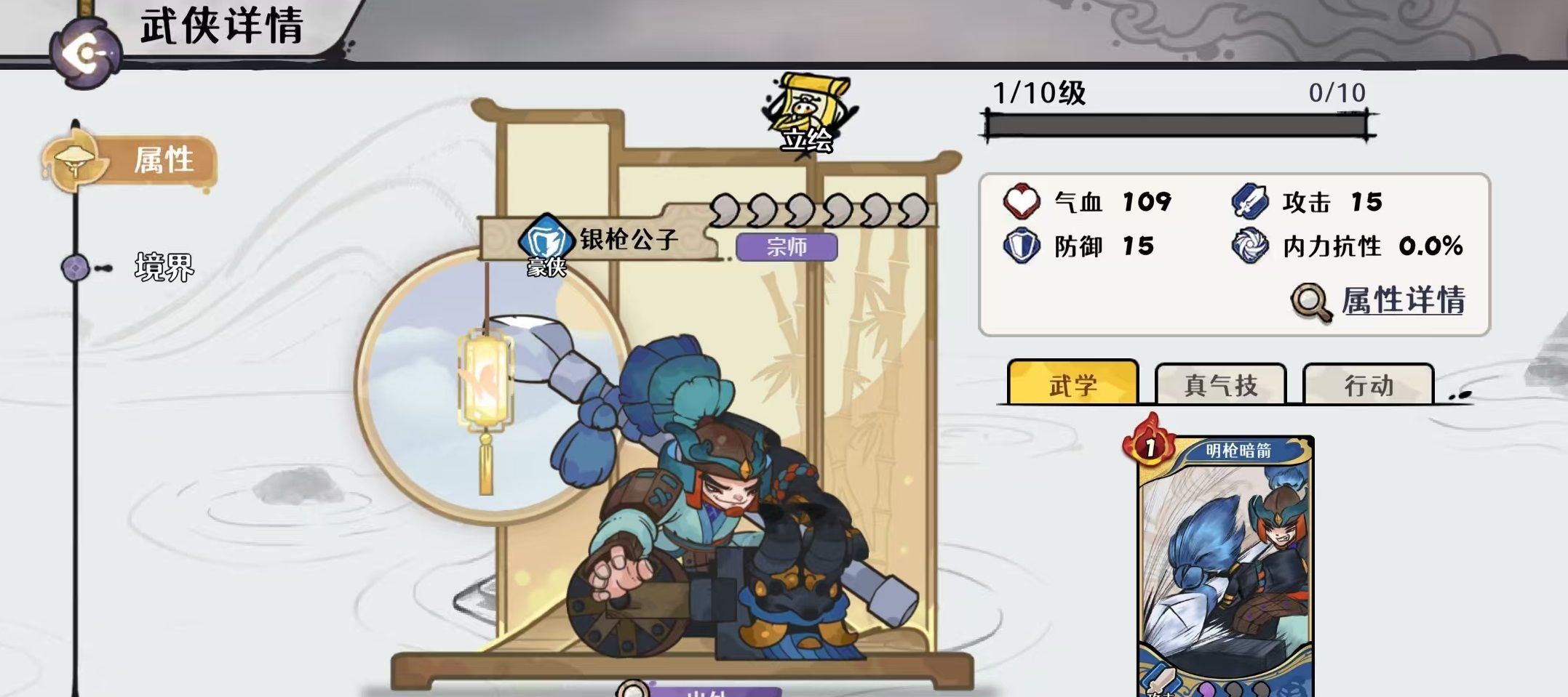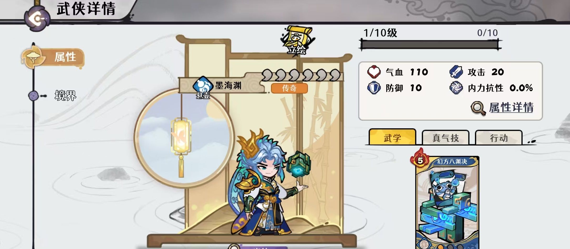 其核心武学“幻方八渊决”可在触发时为友方武侠发现各一张无形武学牌;同时,手牌中每存在一张中立牌,该技能怒气消耗即降低1点,最多减少3点;且于回合开始时自动返回手牌,保障持续可用性。真气技能则在行动开始时恢复1点真气,并允许免怒气打出两张怒气消耗大于1的少年技巧牌;若实际打出数量不足,则按缺失张数补发对应数量的无形少年技巧牌(每缺1张即发现2张);战斗开始时真气自动回满。这一机制使其成为水系技巧流体系中的启动枢纽,兼具续航调控、资源补充与战术容错能力。二命后实现质变,无论在推图开荒还是高难幻境中均具备广泛适配性。
