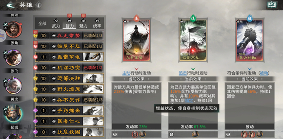 天赋协同是该队爆发力的核心支撑。荀彧天赋“王佐之才”为黄忠提供11%攻击力与防御力加成,并同步提升四项基础属性各15点;张飞天赋可对敌方施加“虚弱”与“易伤”双重减益,既削弱对手输出,又放大我方伤害;而黄忠自身天赋具备精准打击敌方后排单位的机制,与整体战术定位高度契合。