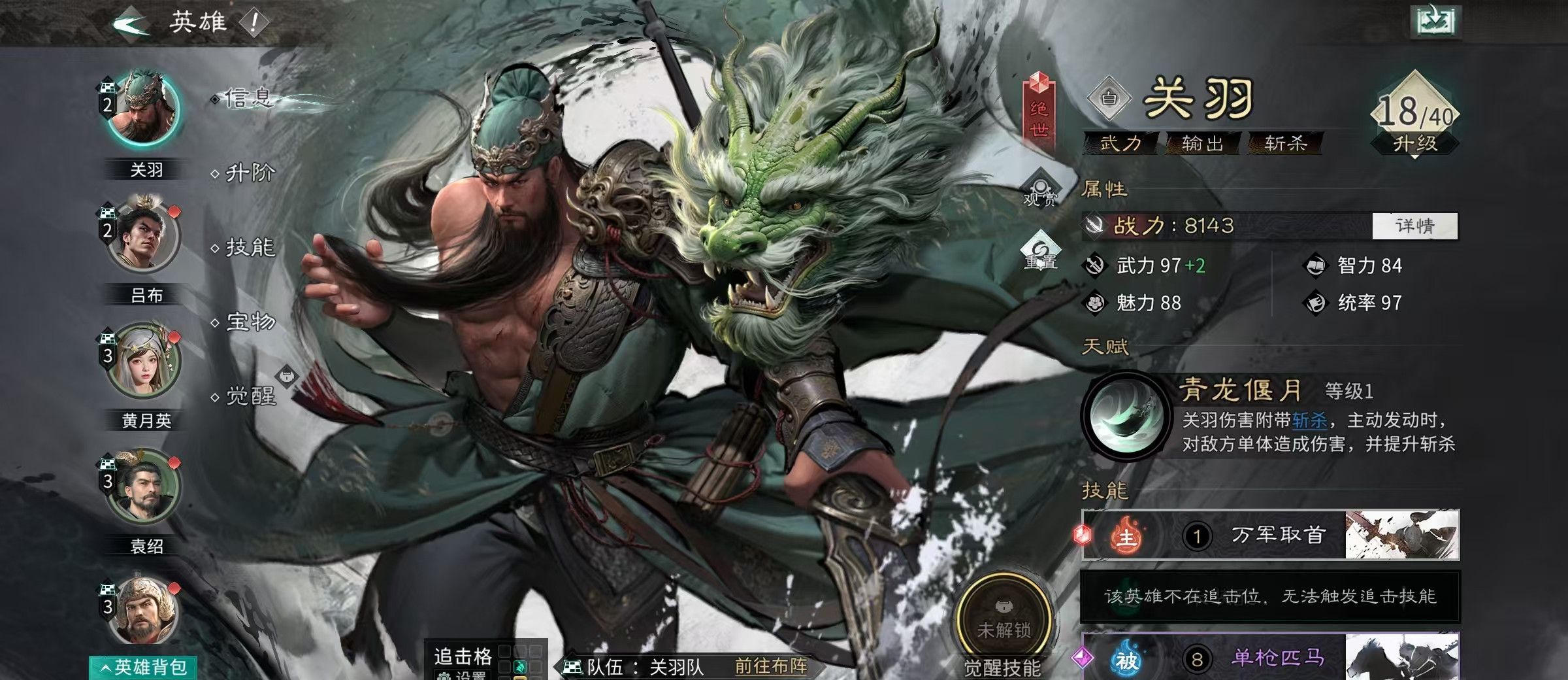 本套推荐阵容采用“关羽—郭嘉—貂蝉”铁三角组合,定位为高爆发、强联动、快节奏的斩杀体系。其中关羽承担主输出与终结职能,依靠天赋锁定敌方武力最低目标并叠加畏状态,能量满层后触发威震华夏实现精准斩首;郭嘉作为核心副C,不仅提供多段范围伤害,更关键的是提升全队天赋技能发动概率,强化连锁反应;貂蝉则负责增益传导与控制衔接,其天赋可大幅提升关羽对男性单位的伤害,并赋予额外两次追击机会。