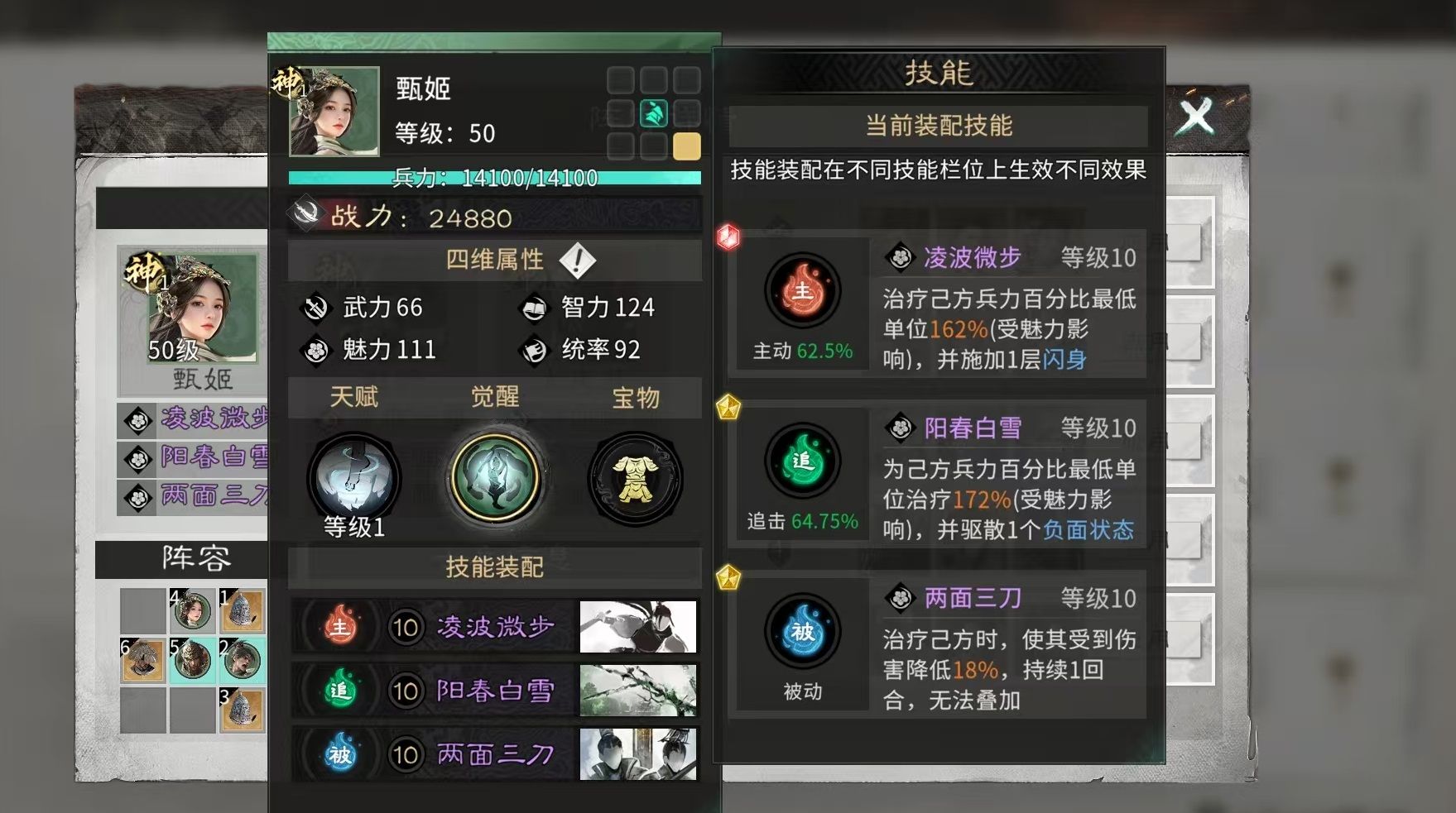 在技能构建层面,推荐采用“凌波微步”“阳春白雪”“两面三刀”三技能组合。其中,“凌波微步”聚焦于低血量单位单体治疗,并赋予“闪身”状态——确保目标必定规避一次直接伤害,与天赋形成双重闪避保障;“阳春白雪”兼顾治疗与净化,可清除己方单位一项负面效果;“两面三刀”则在治疗同时降低受疗者所受伤害,三者协同构成覆盖治疗、驱散、减伤、闪避的立体防御体系,极大延长前排承伤时间与后排输出窗口。