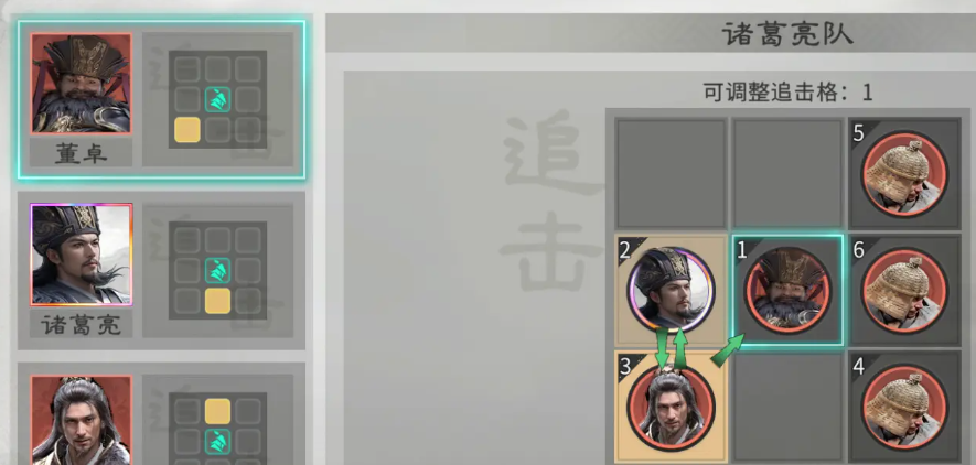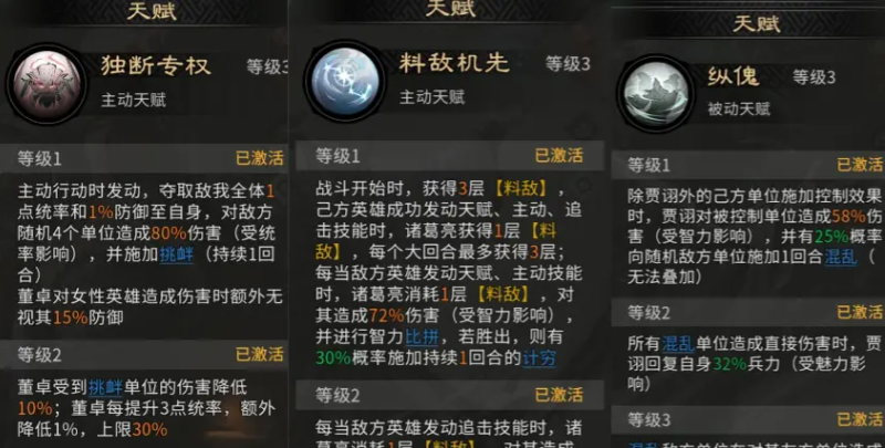 本阵容构建逻辑强调“控场优先、节奏主导”。兵种配置建议前排统一部署藤甲兵,共三名,利用其高生存特性吸收伤害,为后排输出单位争取稳定施法空间。英雄站位需精细规划:贾诩应置于诸葛亮与董卓的追击触发范围内;而董卓本身无需占据追击位,此举可确保其技能释放后,由其他角色高频触发追击效果,形成连贯控制反馈。董卓定位为开局控制发起者,其天赋技能【独断专权】可立即为我方全体降低1点统帅及1%防御,同时对敌方随机4个目标造成80%伤害,并附加1回合挑衅状态——受挑衅单位仅能锁定董卓释放技能,从而大幅削弱敌方整体输出效率与战术灵活性。