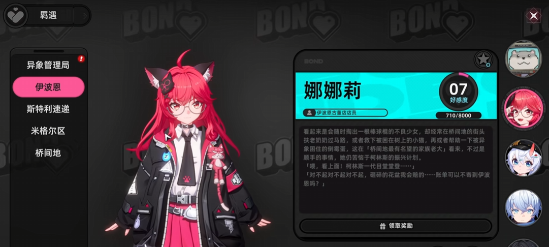 羁遇系统还嵌套了角色专属任务链。以娜娜莉为例,在好感度达到2级、4级、7级时,将分别触发三项独立剧情任务,任务内容紧密围绕其性格特征与世界观设定展开。关键接取入口位于角色界面右上角的“终端通讯”图标(形似手持设备),点击后可查看并承接当前可进行的好感任务。