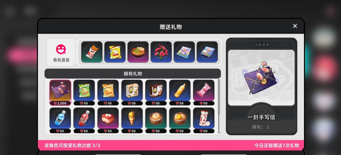 操作路径清晰直观:进入角色图鉴后点击目标人物头像(如娜娜莉),界面右下角会出现“礼物”图标,点击即可打开赠送面板。系统会优先在顶部区域高亮显示该角色当前偏好的物品类型,赠送契合度高的礼物将获得更高好感增幅;下方则罗列玩家已拥有的全部可赠礼物品,选中后一键送出即可完成交互。