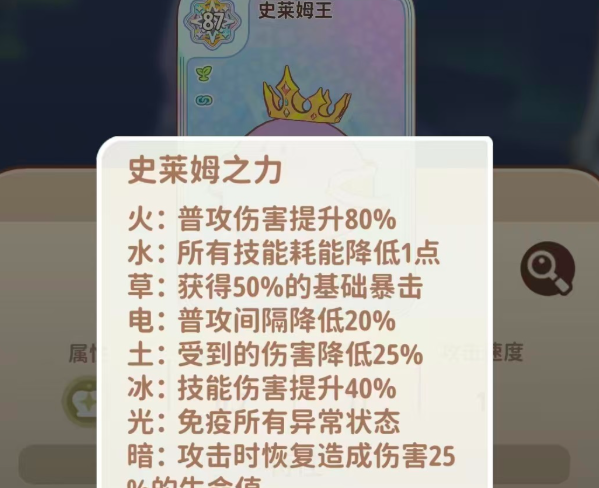 核心强度来源于专属特性“共生增幅”:当队伍中存在任意属性的史莱姆伙伴时,史莱姆王将获得对应加成。例如携带火属性史莱姆,其普通攻击伤害提升80%;若配置水、风、雷等不同属性史莱姆,增幅效果可叠加触发多维增益。该机制不依赖被动堆叠,而是基于阵容构成实时生效,强调策略搭配而非单纯数值碾压。