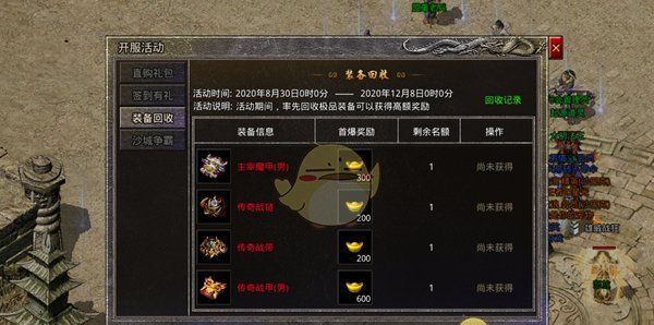 5、最后,想快速升级还是要靠回收装备,RMB玩家建议只回收武器和衣服,此方法代价较高,但是这样升级更快,并且会给护盾材料,可以升级护盾。【防御高了就可以打群秒的BOSS了】 而非人民币玩家则可以把衣服武器捐献到行会仓库里面换取贡献度,然后用贡献换取其他部位的装备进行回收。【升级速度也很快哦】废话不多说了,抓紧进入游戏升级吧!