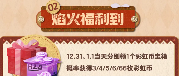 活动期间设有双日登录奖励机制:12月31日与1月1日各开放一次彩虹币宝箱领取入口。每位玩家每日限领1个,开启后随机获得3枚、4枚、5枚、6枚或66枚彩虹币,具体数量由系统随机判定,无保底机制。