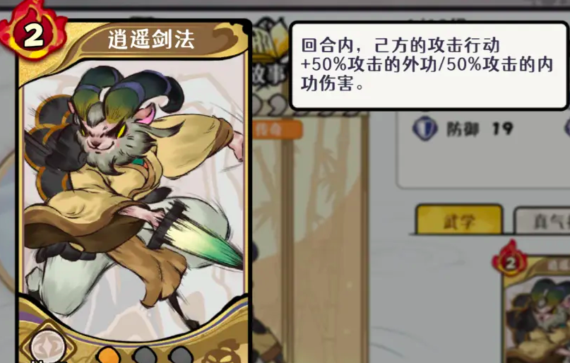 武学卡牌-“逍遥剑法“,在初始一星的状态下,回合内,己方的攻击行动增加50%的外功伤害,或者是增加50%攻击的内功伤害,而随着等级的提升,每次外功伤害或内功伤害的增加值也会提升10%,该角色不仅自身可进行高效输出,且聚敌能力很强,对整个团队也有着比较好的帮助,对于那些想打输出流的玩家来说是必选角色。