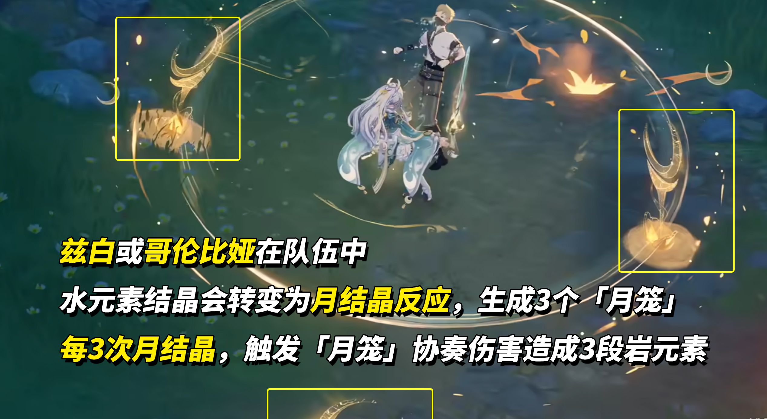 当队伍存在“将水元素结晶转为月结晶”的角色时,触发水结晶会在场上生成「月笼」,队伍每触发3次月结晶,「月笼」会自动攻击周围敌人造成3次岩元素伤害。