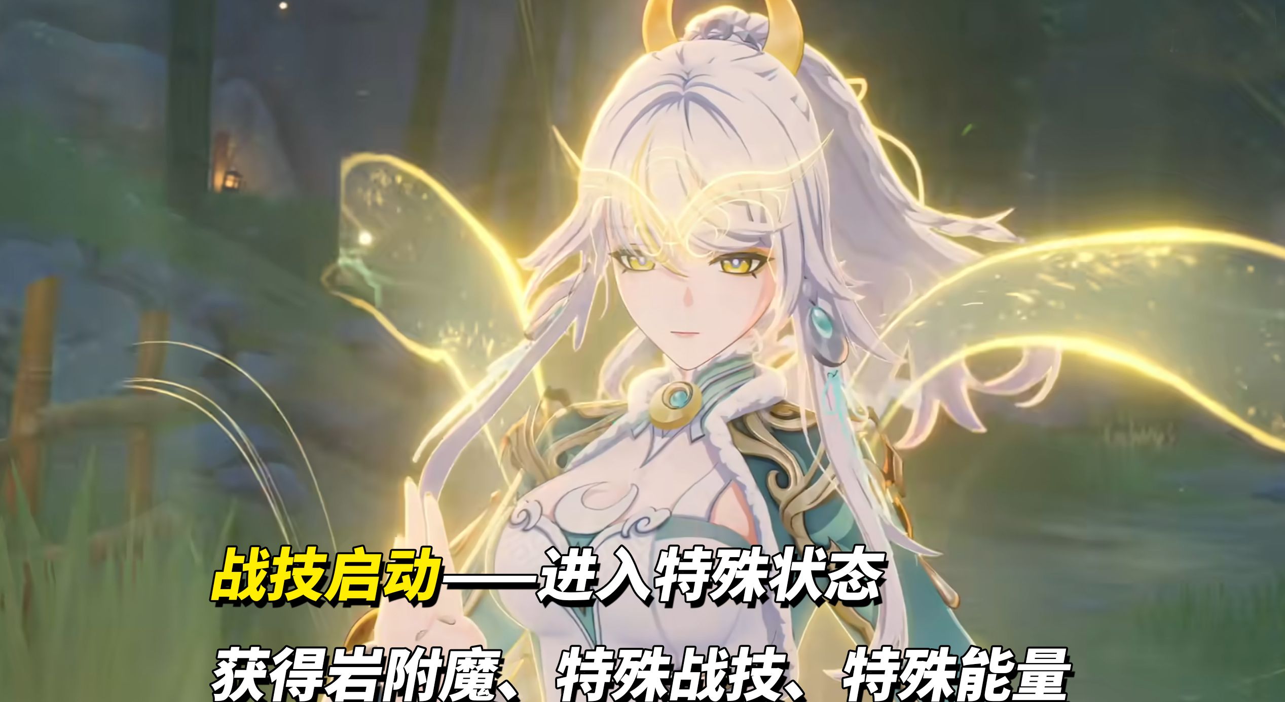 ②角色身旁多了一管特殊能量条,随时间增长、触发月结晶、持续普攻都会获得特殊能量。当旁边亮起月亮图标时,兹白战技会切换为特殊战技「灵驹飞踏」,施放法术造成月结晶反应伤害。一次战技期间可施放多次「灵驹飞踏」。