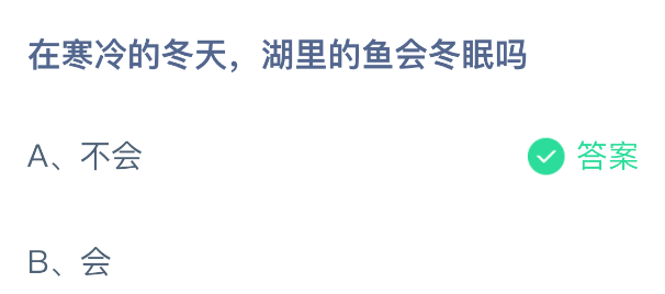 以上就是在寒冷的冬天,湖里的鱼会冬眠吗,支付宝蚂蚁庄园2026年1月12日答案最新,更多精彩内容,请点击关注更新!