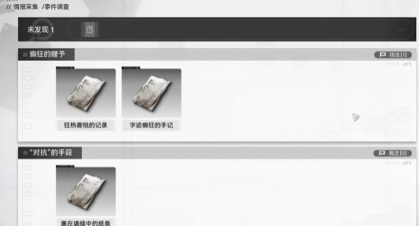 开放世界的场景探索是情报档案最基础且核心的获取方式,这类档案的分布更贴合每个区域的环境,需要管理员结合场景的特征主动排查和寻找,情报档案多以可以交互的物品形式存在,常见的载体有破损的终端残骸或者是堆叠的桌面文件,与常规物品不同,这类答案没有明显的引导标识,只能通过特定的视觉特征来区分,触发交互动作之后就可以获取对应的答案内容,部分答案还会以碎片的形式呈现,需要收集多份碎片才能够拼接成为完整的信息。