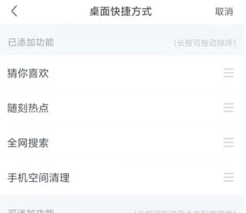 软件默许展现的为猜你喜爱,随刻热门,全网查找,手机空间整理四项,假如需求修正,点击右上角修改按钮进行修改。