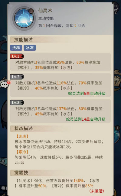 在游戏中的教母菲娅其实可以跟水队放在一起搭配的时候,带来更多的寒冷效果加成,在有这类加成效果的时候,大家可以利用起来的法伤效果会更好,而在技能当中大家可以看到的仙灵术作为主动技能,在第1回合当中释放的话,造成的法术效果是对群的攻击,且有一定的机会可以造成冰冻,如果对敌方随机的3名单位造成95%法伤的话,在上面还有60%概率可以施加寒冷状态给敌人,其中有35%概率施加的是冰冻能力,而这个能力在教母菲娅蛇灵达到14星的时候其中的数值会自动升级,这个时期就有45%概率施加冰冻,而这里冰冻的效果其实就是让被冰冻单位再自身行动的回合里面无法行动,而在后续的2次受击后可以解除,其中的每个单位1个回合内是只能被冰冻1次的。