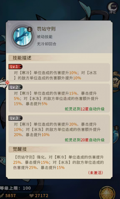 最后是教母菲娅的罚站守则这个被动技能,在这个被动当中会让她对自身可以造成的寒冷状态施加的单位,在造成的伤害上面可以提升10%的效果,对有冰冻状态的敌方进行攻击,在伤害上面会额外提升10%的效果,所以在这个技能使用之前是一定提前用来上面的几个技能的,在连招当中这个技能也是只能当中最后的招式使用,才可以得到输出最大化的能力,而在蛇灵达到20星的时候,此时培养之后的技能数值会有所提升,比如升级了之后教母菲娅对施加了寒冷状态的那个敌人进行输出,这里造成的伤害提升20%,暴击提升10%,而之前有冰冻在身上的敌方她会造成的伤害额外提升20%、暴击提升10%。