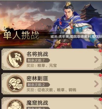 密林剿匪每一天都会刷新不一样的任务,其中部分的关卡还会有阵营限制,例如禁止吴国武将出战。记得要提前搭配好符合要求的队伍,随着等级的提升,就会解锁更高级的关卡,奖励也会直接翻倍。在这里就可以获得粮草,还有铜钱,全部都是日常资源补给的重要来源。魔窟挑战的奖励还是比较丰富的,可以获得武将经验书,还有铜钱,每天可以挑战三次,前期不需要去追求高难度,根据自身的武将战斗力去选择合适的关卡,可以确保稳定通关,能拿满奖励。