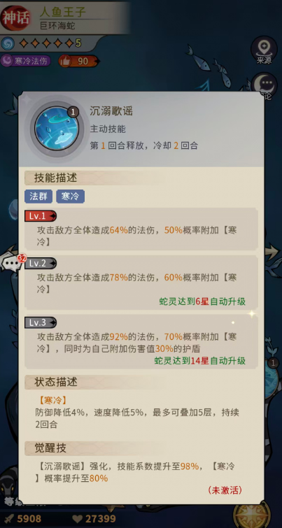人鱼王子的主动技能叫做沉溺歌谣,这个技能上就有一定的寒冷效果可以用到的了,攻击时可以给敌方全体造成64%的法伤,且有50%概率附加【寒冷】的状态,这里【寒冷】的状态会让敌人身上的防御降低4%,速度降低5%,叠加5层的时候这里的速度影响就非常大了,且在达到技能三级的时候就变成攻击敌方全体造成92%的法伤,70%概率附加【寒冷】,同时为自己附加伤害值30%的护盾,所以在这里他后期给自己带来的保护能力也不弱,且相比其他的蛇灵,人鱼王子身上的等级提升很快,只要14星的时候就可以解锁技能等级3的能力,所以后期他能够达成的觉醒技强化也很快,得到强化之后的他在技能系数上面直接提升至98%,而【寒冷】状态施加成功的概率提升到80%,算是非常高的一个数值了。