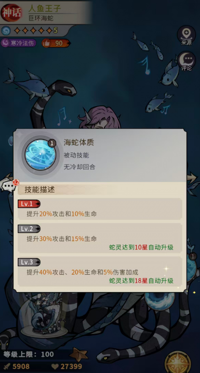 海蛇体质会人鱼王子身上的各个属性得到增强,提升了20%攻击和10%生命之后,还有升级的空间可以提升更高的数值,比如在3级的技能效果当中是可以提升40%攻击、20%生命和5%伤害加成。