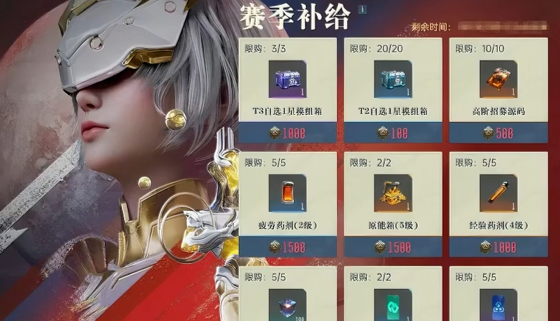 在赛季补给当中,玩家需要挑战赛季任务,从而直接获取赛季货币,最终使用这些货币来兑换赛季限购的物品,建议上个赛季就并未将所有赛季货币消耗殆尽的玩家,直接预留到下一个赛季之中进行兑换,在下一个赛季内,玩家可以直接兑换三个T3自选1星模组箱、二十自选1星模组箱、十个高阶招募源码、五份疲劳药剂、两份原能箱、五份经验药剂、两份动员令、五份贸易特许令。