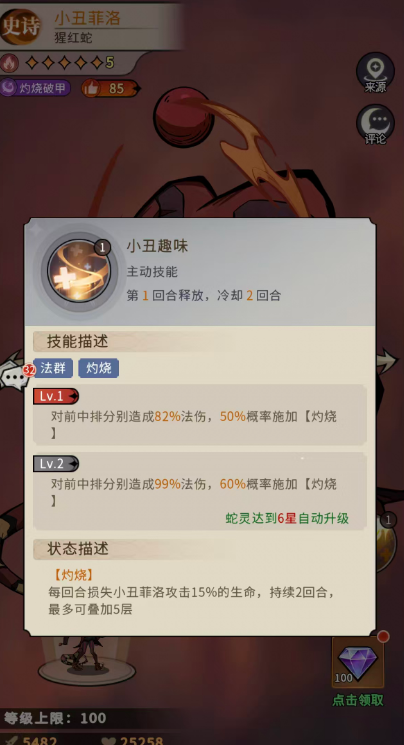 首先是小丑趣味这个技能,这是小丑菲洛的主动技能,可以在第1回合释放,就是需要冷却个回合,才可以接着再次使用,其中是包含有法群灼烧的效果,可以对前中排分别造成82%法伤,所以在这里先手输出可以覆盖的范围只是略过了后排而已,而且其中有50%概率可以施加灼烧,灼烧状态的效果就是每回合损失小丑菲洛攻击15%的生命,大家最多可以把这个状态叠加到5层,此时失去的生命数值就换成了非常高的输出数值,而且在蛇灵达到6星的时候他的技能就升级为对前中排分别造成99%法伤,60%的概率可以成功施加灼烧。