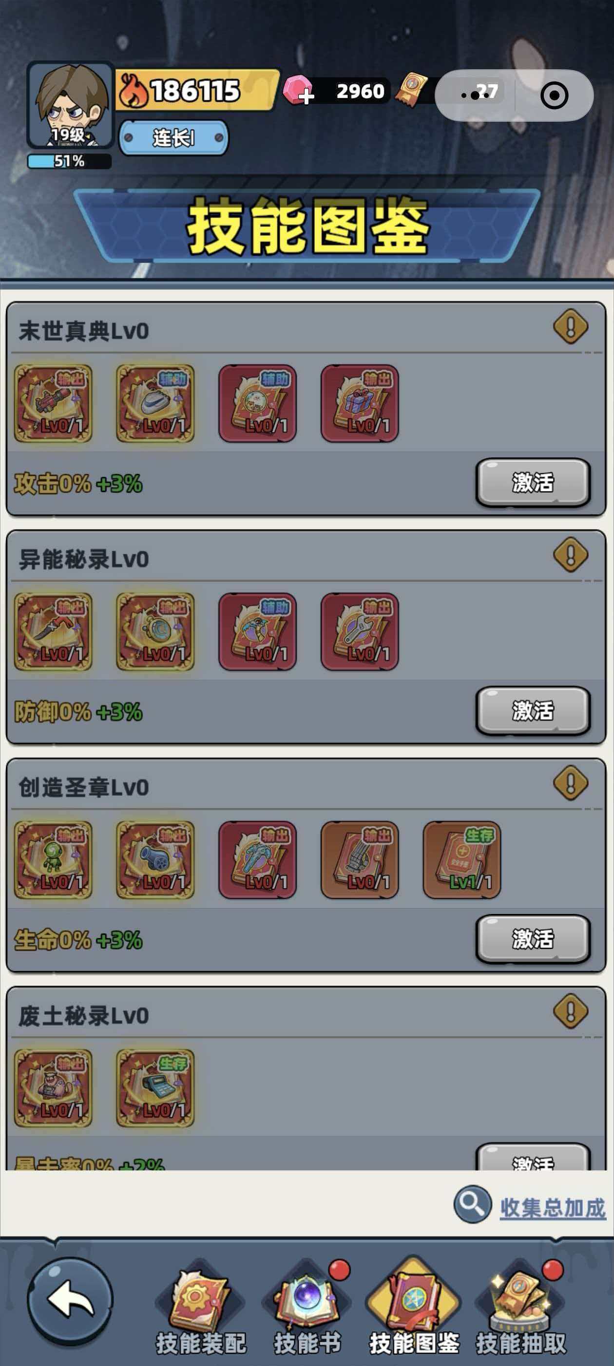 技能书想要解锁的话,有两种方法,第一种就是用技能召唤券去抽取技能书了,第二种则是探索获取技能书,技能召唤券是专门用来抽取技能书的卡券,这种卡券想要获取的话,一共有三种方法,分别是基金、末世探索以及黑市购买,基金就是需要玩家开通技能书基金,开通技能书基金以后,玩家每进一阶以后,都会获取指定数量的技能书奖励,末日探索就是玩家在地图上探索时,可以通过对房间进行探索来获得技能召唤券,这里能够探索的房间,大家打开世界地图中,看到显示着开门样式的房间就能够去进行探索,最后一种黑市购买,则需要玩家在更多页面中找到黑市,这里会出售技能召唤券,不过需要玩家使用钻石购买,一张召唤券收件150钻石,价格还是比较高的,若是玩家财力不足的话,不建议使用这种方法购买技能召唤券。