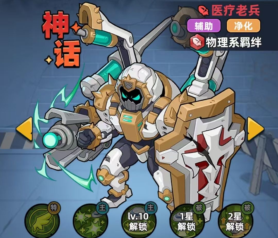 厨神隶属于异能系羁绊,核心能力聚焦于持续回血与能量供给。其主动技能可对生命比例最高的友方单位投喂美食,每1秒恢复大量生命值,效果持续时间长且支持多层叠加;大招“黯然销魂饭”在战斗初始即自动生效,当任意队友生命值低于50%时,可即时消耗该效果为其恢复生命。相较之下,医疗老兵归属物理系羁绊,主打群体治疗与净化控制。其主动技能可同时治疗四名友军,并为全体友方清除两个随机非玩家施加的减益状态,具备不可替代的驱散价值。