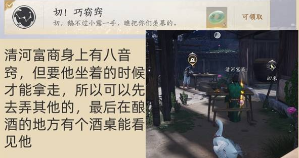 清河富商身上有八音窍,但要他坐着的时候才能拿走,所以可以先去弄其他的,最后在酿酒的地方有个酒桌能看见他