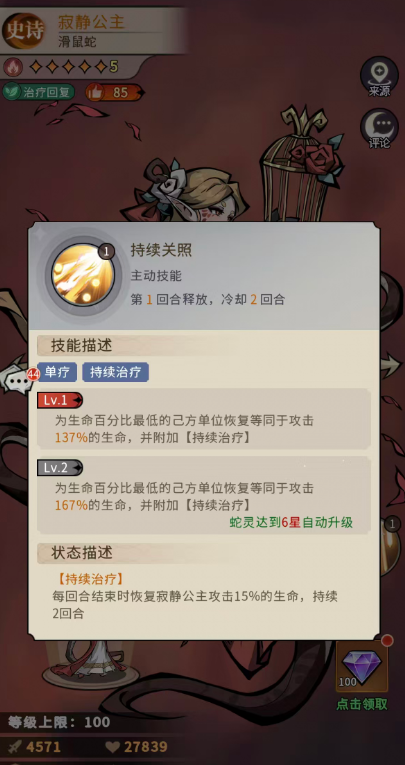 寂静公主的第一个技能叫做持续关照,这是一个单体治疗的效果,且是可以在生效期间给角色带来持续治疗能力的,这里是为生命百分比最低的己方单位恢复等同于攻击137%的生命,此时还可以附加持续治疗,其中在升级之后蛇灵达到6星的时候,还可以自动升级为等级2的效果,此时针对生命百分比最低的己方单位恢复的数值,是等同于寂静公主身上攻击数值167%的生命回复,并附加持续治疗的影响,这里持续治疗的状态是在每一个回合结束时恢复寂静公主攻击15%的生命,所以这里单体的回复也是以后多层数值叠加的,至少给单个角色回奶是足够的。