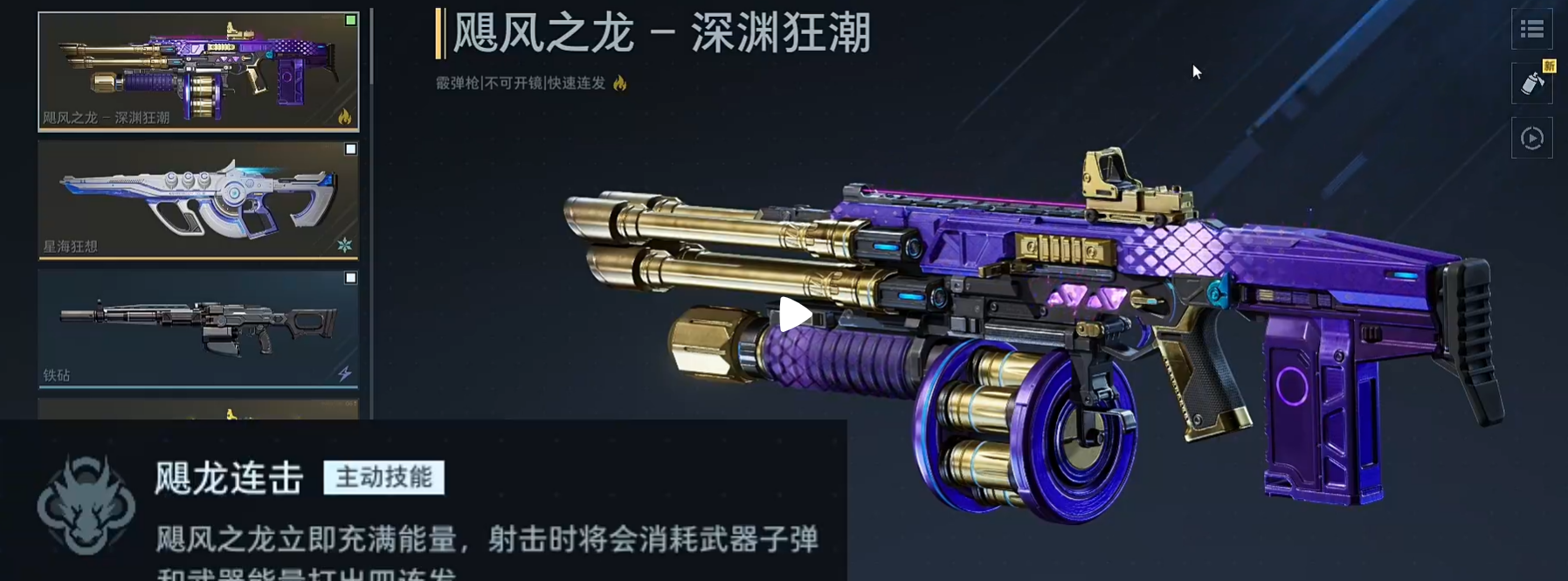 飓风之龙·深渊狂潮具备双技能结构:主动技“飓龙连击”与被动技“炙热龙炎”。开启飓龙连击后,武器即刻完成能量充能,后续每次射击触发四发连射,消耗当前弹匣子弹及独立能量值。该机制显著强化短时爆发能力,在Boss战中可快速削减目标血量,尤其适用于阶段转换或机制爆发窗口期。