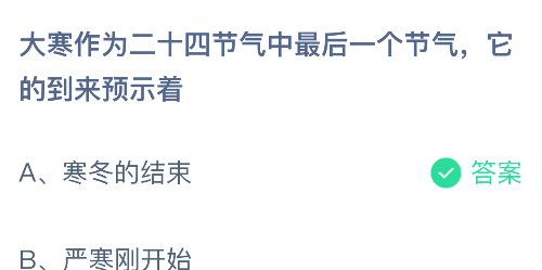 以上就是大寒作为二十四节气中最后一个节气,它的到来预示着?支付宝蚂蚁庄园2026年1月20日答案最新,更多相关攻略,请关注3dm手游网更新!