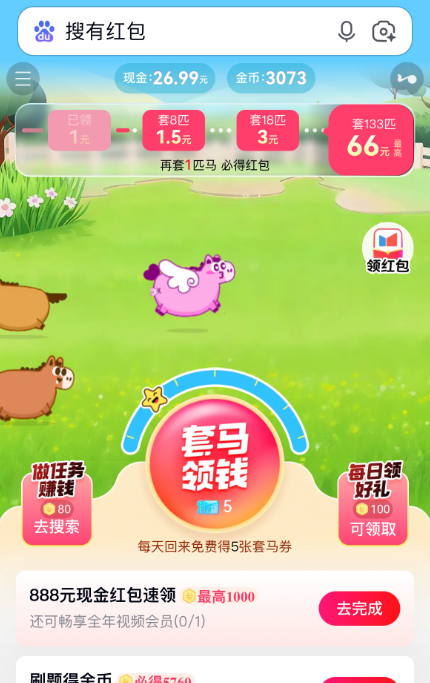 百度APP现开启“套马红包”活动(原搜有红包)。用户可在手机端百度搜索“套马红包”进入活动界面,通过完成签到、答题、搜索、邀请好友等任务领取奖励。积累一定金额后方可提现。