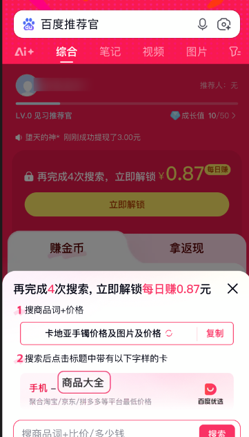 百度推荐官入口可通过点击指定链接或在百度APP内搜索“百度推荐官”进入。登录后,您可通过完成任务、邀请好友获得金币,累积后可兑换佣金并提现,实现轻松赚钱与购物返现。