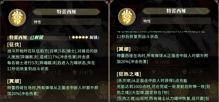 其核心增益技能「冲击力损伤增幅」存在多重叠加条件:当特蕾西娅施放冥顽属性技能,且队伍整体正面命中目标时,除基础生命值提升20%外,每提升1星(最高升至11星),该增幅效果将阶梯式强化。具体表现为:骑士在场或狂热之魂存续期间,冲击伤害加成区间为40%至200%;升至9星时上限提升至400%。该增幅数值严格绑定角色自身特性及实时战场状态,不可脱离条件单独生效。