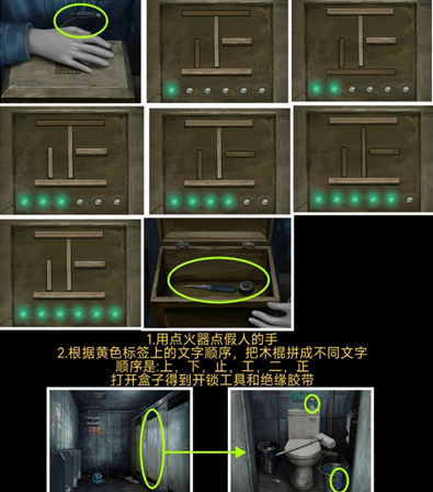 6、观察厕所玻璃里面的荧光手印,按照“左右左右右右左”的顺序依次点击安检口地上工具箱的左右按钮.