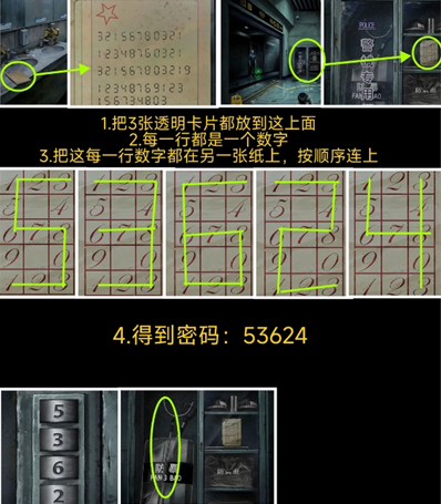 8、三块透明卡片全部拼好后,得到5组数字;每一排的数字为一组,把每一组数字按照顺序,在警械专用柜上的数字条上进行连接可得5排数字分别连线出来对应的数字为“53624”,在柜门密码锁处输入密码.