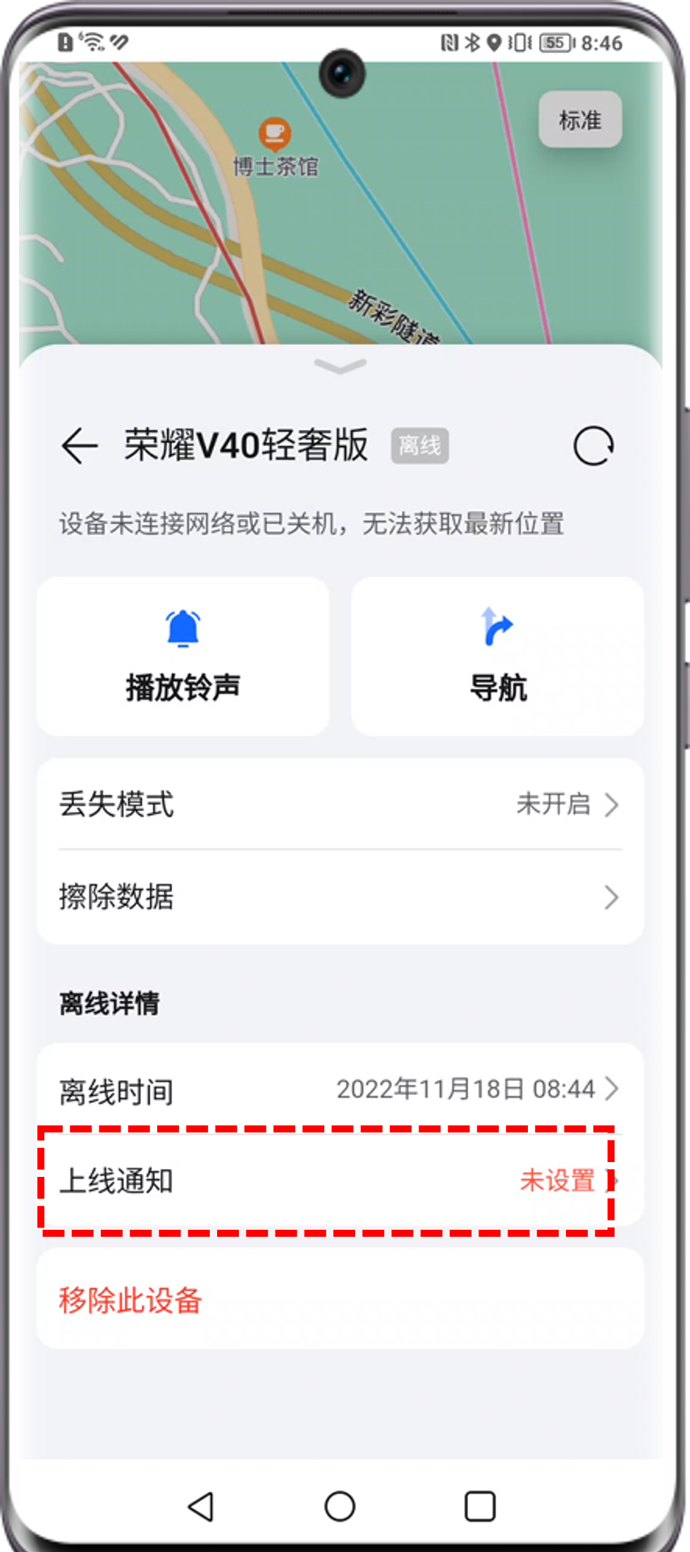 当丢失设备的远程连接网络功能处于开启状态时,如您通过查找设备功能定位该设备,但因该设备未联网而无法定位时,查找设备功能将远程自动发起联网指令,尝试重新开启离线设备的移动网络开关,帮助您定位查找。