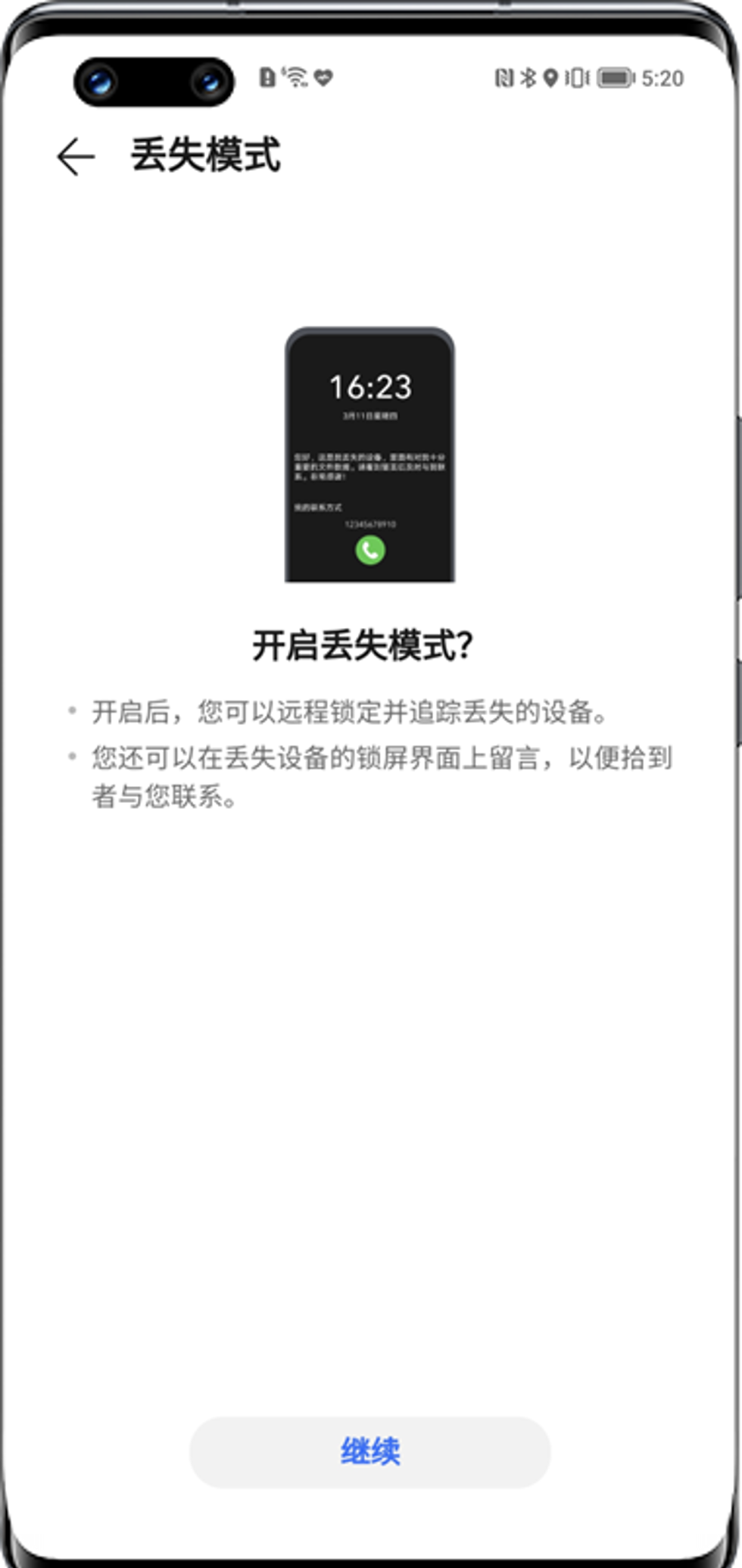 1) 远程锁定。通过开启丢失模式远程设定数字锁屏密码锁定遗失设备,然后导航前往;