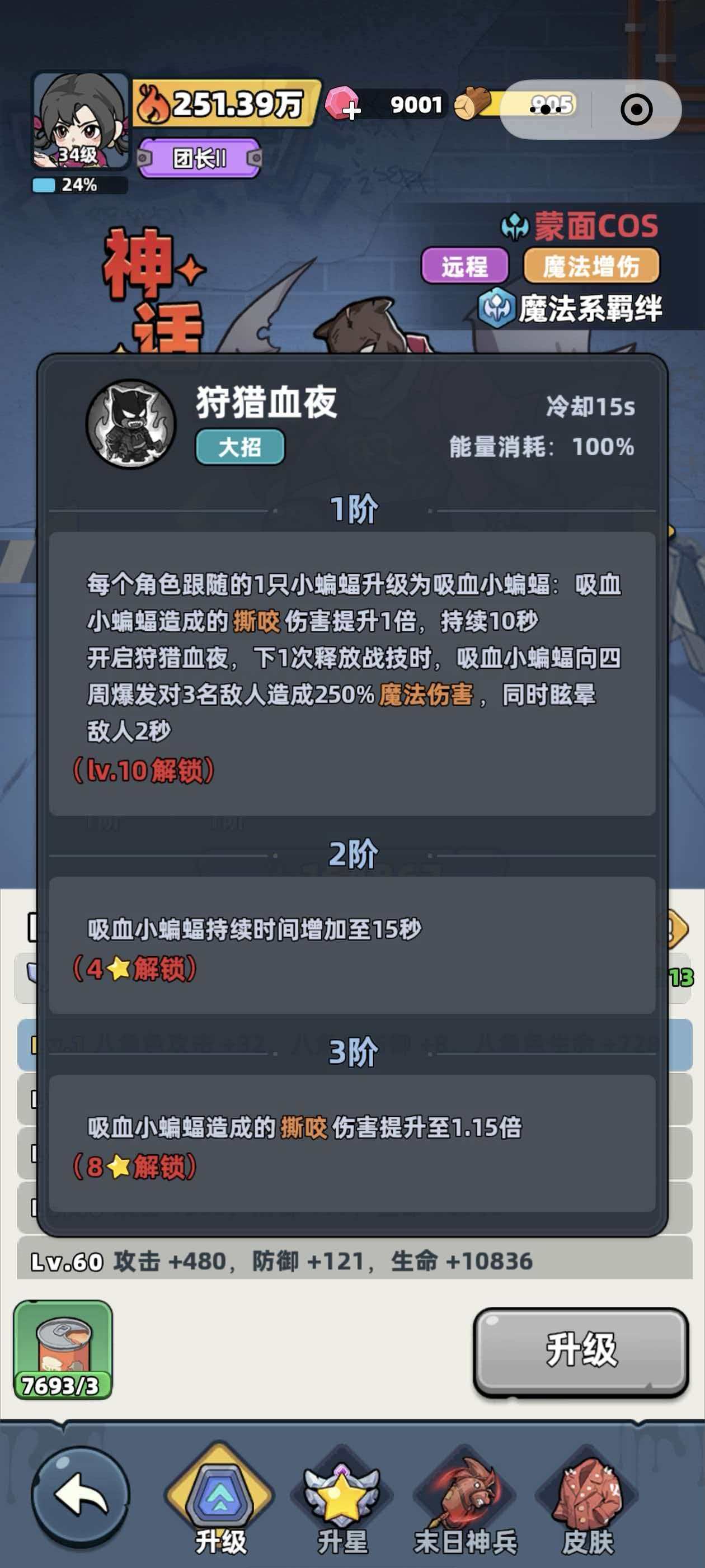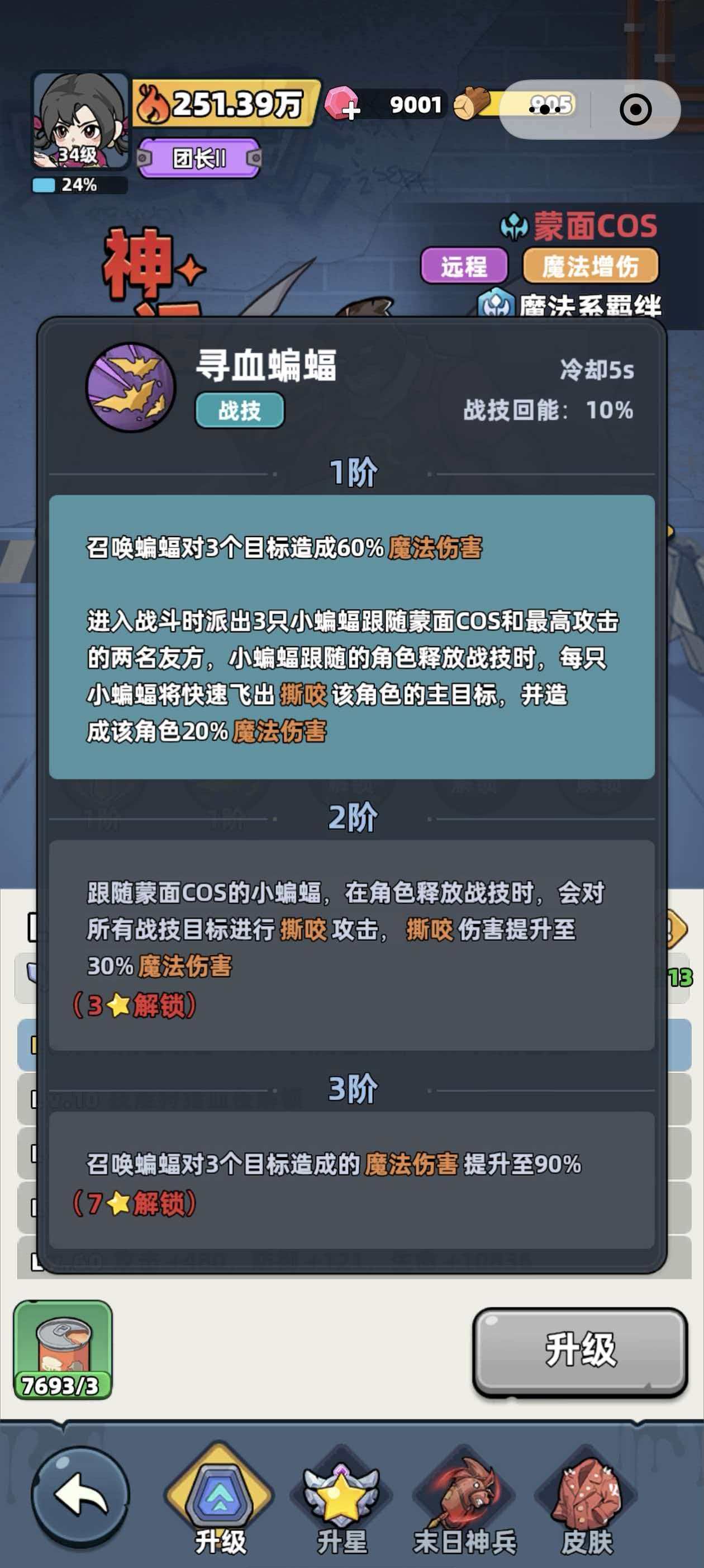 战技寻血蝙蝠是一个可以召唤出蝙蝠对敌人攻击的技能,该技能能够一次性对3名敌人造成60%的魔法伤害,进入战斗后蒙面cos可以召唤出3只小蝙蝠,跟随在自己以及队伍中攻击力最高的2名队友身侧,当角色释放战技的时候,小蝙蝠则会迅速的朝着敌人不断的撕咬,能够造成20%的魔法伤害。