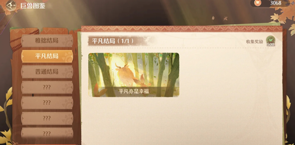3、第三只巨兽,完成结局【平凡亦是幸福】,达成条件总值>1996,且没有A和S。
