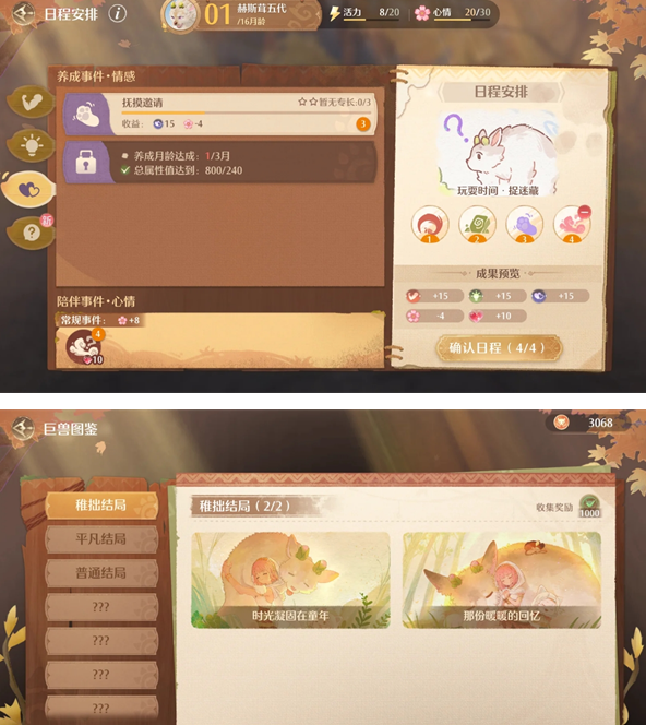 在《无限暖暖》2.1版本中,“巨兽成长日记”限时任务需培养4只巨兽以达成4种不同结局,从而解锁600粉钻等核心奖励。每种结局由巨兽在16月龄养成结束时的总属性值与各属性评级决定。以下是快速达成四种结局的养成攻略:
