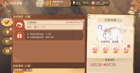 开局赠送的数值平均+到每一个属性里,依旧不需要点任何互动喂食游玩,直接安排日程(建议按需增加减少属性收益的课程)(课程安排示例如下图)与第一种不同的是,注意均衡每种属性数值,直至16月龄结束,所有属性数值全c并相加<1997。