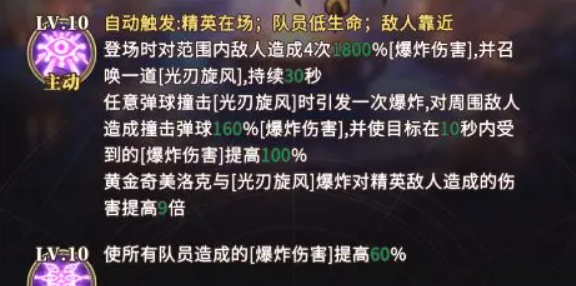 她的主动技能在登场瞬间触发,对范围内敌人连续发动4次攻击,每次造成1800%的爆炸伤害;同时生成一道持续30秒的光刃旋风,作为关键协同机制存在。