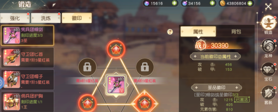 徽印镶嵌为第三重属性拓展维度。每件装备设有独立徽印槽位,镶嵌相同星级的徽印可触发“印记奖励”;当全部槽位填满同星级徽印时,额外激活套装徽印效果。徽印主要通过限时运营活动产出,集齐指定数量后可解锁专属套装属性。需特别注意:徽印激活存在装备星级与阶级双重门槛,且更换装备时徽印无法自动继承,必须手动拆卸并重新镶嵌。宝石系统提供第五维战力补充——每件装备支持镶嵌5颗不同种类宝石,宝石等级越高,基础属性加成越显著,是后期战力突破的关键支点。