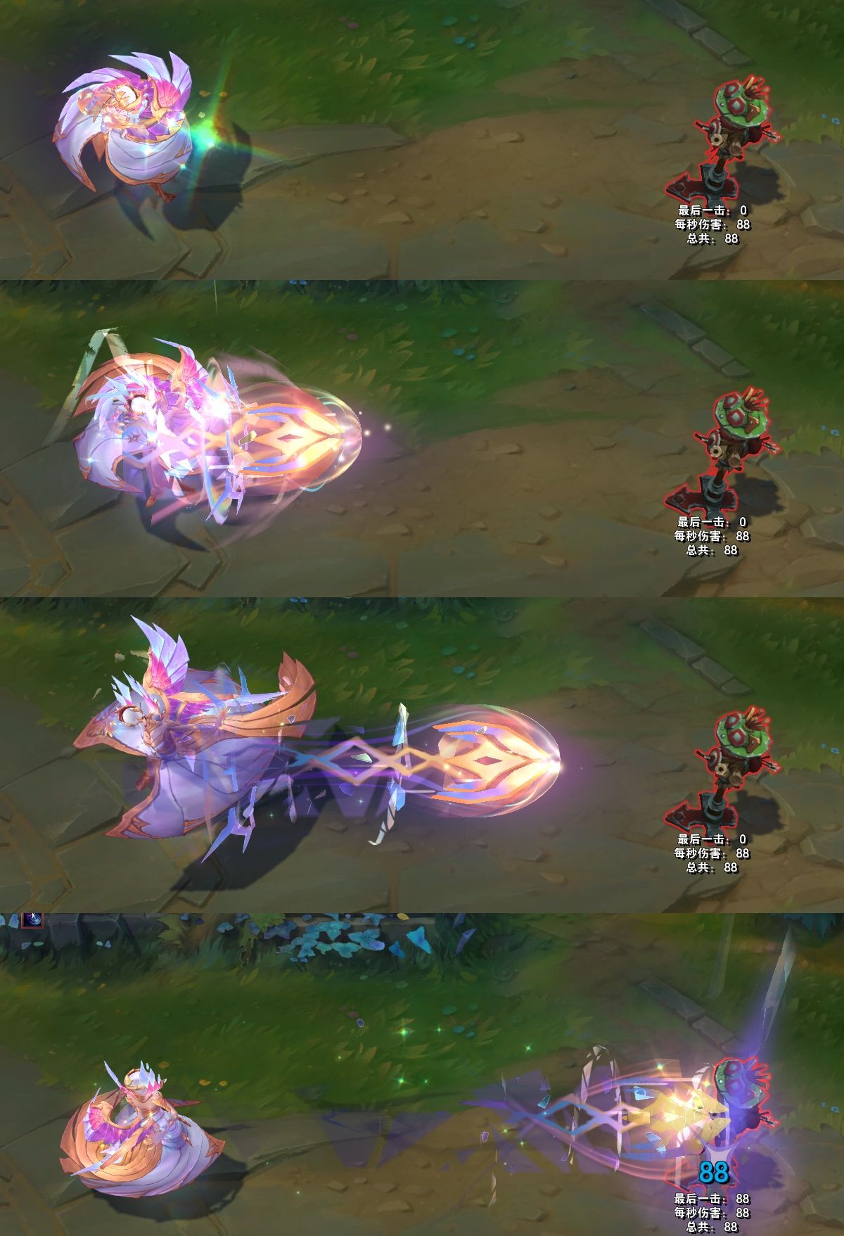 W技能,一把剑从天而降,地面上出现青绿色的亮光以及光晕,区域内是彩绘玻璃的图案,表面还会出现一些钻石。