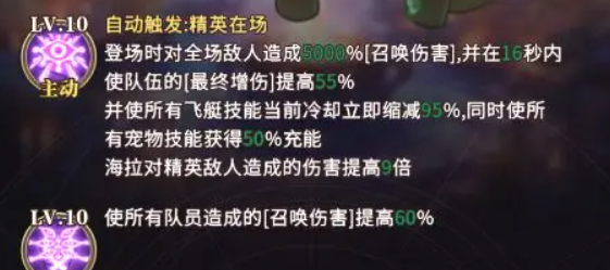 海拉的主动技能为登场即触发,无需手动释放。她将在入场瞬间对全体敌方单位造成5000%召唤伤害,并在随后16秒内,为全队提供55%最终增伤效果。该增益直接作用于输出结算环节,显著提升队伍整体爆发上限。